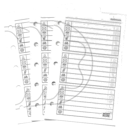 These small Montblanc loose sheets have been designed for the pocket sized organiser. Each page has the ring binder holes punched out of each page and these particular sheets are the 'Personal Details' pages featuring areas to write down all your personal addresses, phone numbers and contacts.