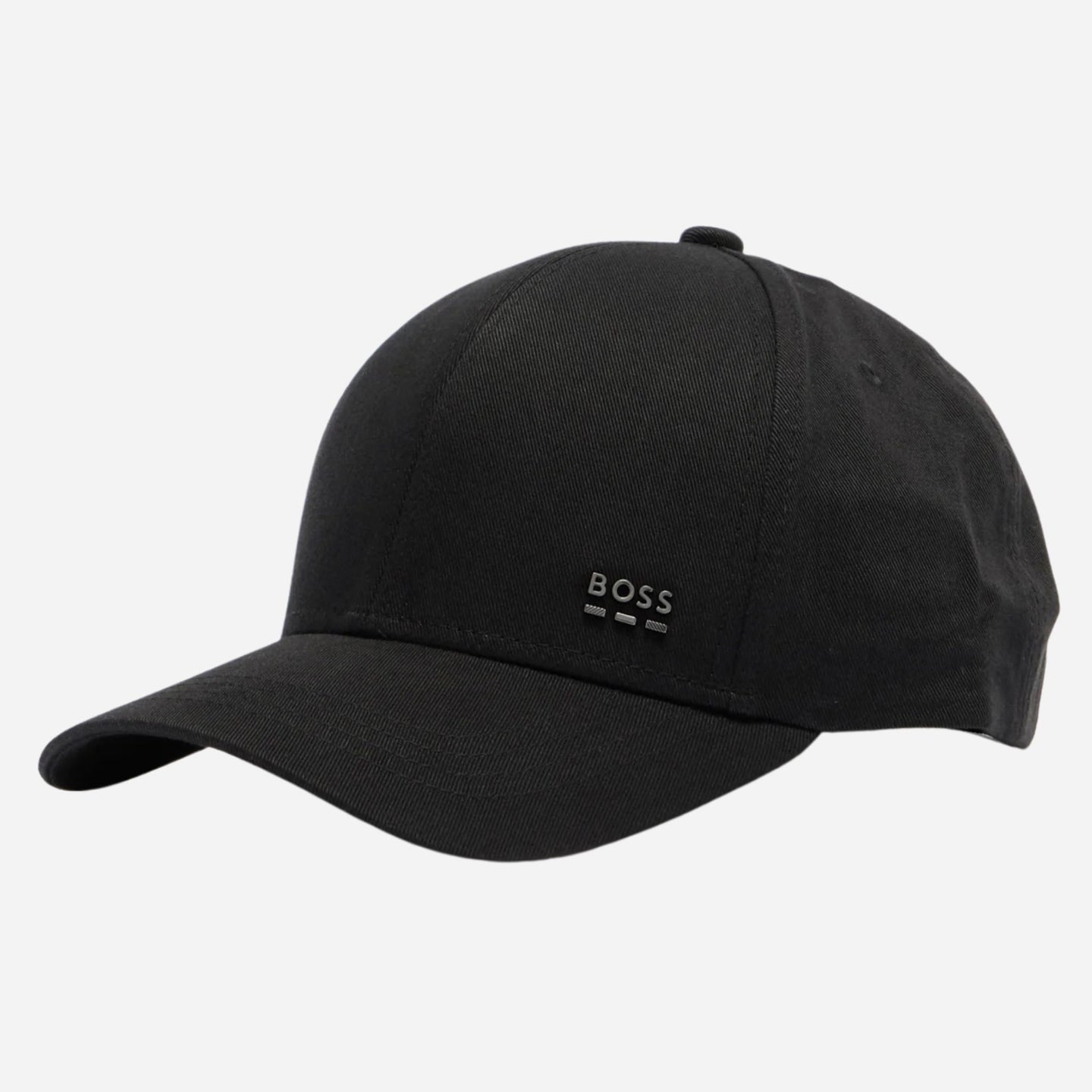 - Branding: BOSS brand name in silver-tone metal lettering on the side of the cap above metal three stripe logo.