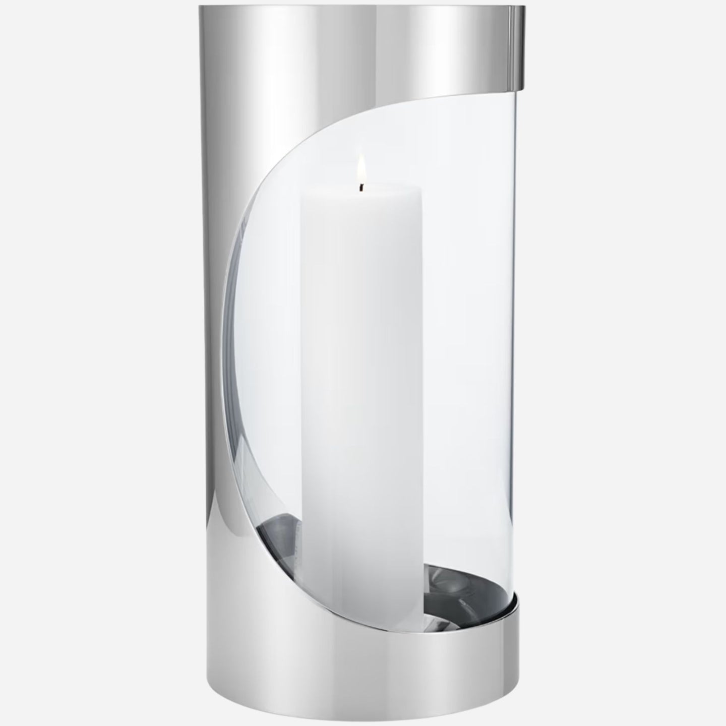 This large hurricane candleholder has been designed with a sleek and minimal appearance by Maria Berntsen for Georg Jensen's Chrome Contours collection. These timeless and unique pieces are created using polished stainless steel and glass, and are perfect for creating a warm and cosy glow in outdoor spaces. This piece has a conveniently removeable tray for easy cleaning, and accommodates pillar candles up to 7 cm in diameter. This Georg Jensen Chrome Contours candleholder will arrive in a Georg Jensen presentation box.