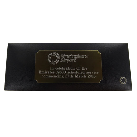 The marketing team at Birmingham Airport approached us as they wanted a VIP gift to present to a dignitary to celebrate the launch of a new route out of Birmingham Airport by Emirates Airlines. This new service was the Emirates A380 Scheldued Service and the team chose a Montblanc pen to mark this occassion. We engraved the pens cap and attached a gold plaque to the lid of the box with the airports logo and text engraved on to the plaque. The logo stands out clearly on the polished metal surface. An engraved plaque is the perfect way to add your own personal message and/or company logo to a Montblanc pen.