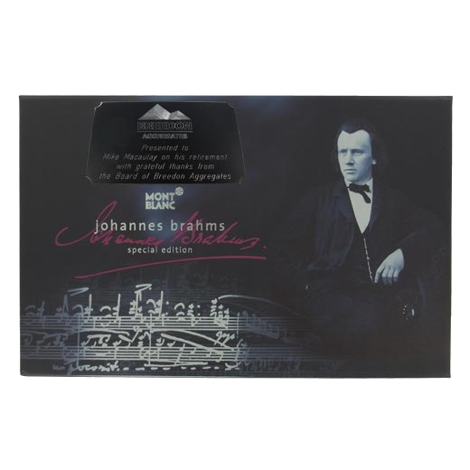 Breedon Aggregates where looking for a bespoke gift to present to a retiring colleague after completing many years of loyal service to the company. At Wheelers we where able to create for Breedon Aggregates a Montblanc pen set comprising of an engraved Montblanc Brahms Ballpoint pen. An embossed pen pouch and a beautiful engraved silver plaque attached to the lid of the Montblanc presentation box. The silver plaque engraving was quite a challenge as Breedon's logo was quite complicated but our engravers like a challenge and we think it came out looking fantastic. Breedon where overjoyed with the end result as was there retiring employee at receiving such a beautiful gift.