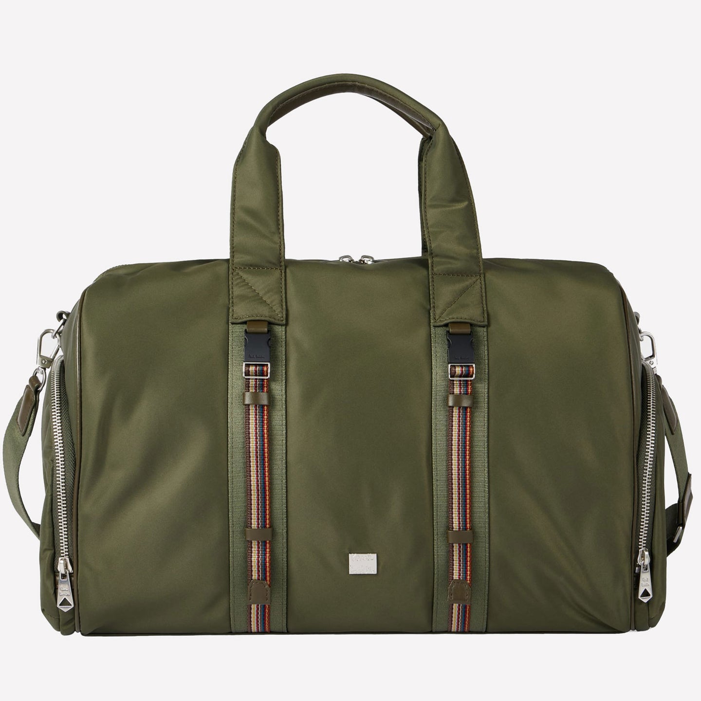 This green holdall has been designed by Paul Smith as part of the iconic Signature Stripe range. Created using eco-friendly recycled nylon, this bag features green leather trims and dual zip closure. On each side of the holdall you’ll find a zipped pocket for extra organisation. Inside is a spacious main compartment as well as a zipped pocket. This versatile bag has two grab handles as well as an adjustable and removable cross body strap to allow you to wear or carry it in a variety of ways. The iconic Signature Stripe detailing is found on straps on the front and the back of the holdall. You’ll also see the Paul Smith signature on a silver tone metal stud on the front of the bag as well as embossed in silver foil on a green patch inside.