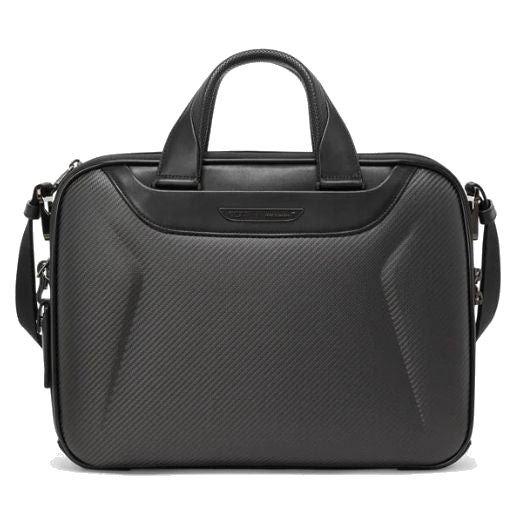 The slim carbon Axle briefcase designed by TUMI x McLaren is a splendid piece that is perfect for the modern-day commuter. The McLaren slim Axel briefcase is crafted out of carbon fiber with papaya accents. Featuring external pockets, this black TUMI briefcase features an internal padded laptop sleeve that will fit up to a 14" screen. TUMI's Axel McLaren brief is fitted with a leather patch and luggage tag that can be embossed at the time of purchase.