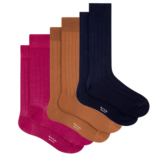 A three-pack of plain ribbed knit socks crafted in a blend of ultra-soft cotton and polyamide. Paul Smith's plain ribbed knit cotton blend socks are available in one size and have the Paul Smith brand name on the sole. Paul Smith's cotton blend ribbed knit socks will be presented inside a presentation box with stripes down the side and a window so you can see the contents.