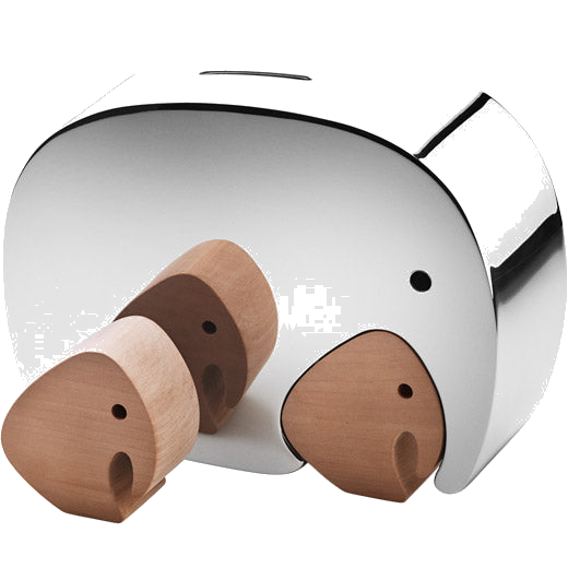 The polished stainless steel mother elephant cradles her baby made out of solid oak under her trunk. A tactile puzzle as well as an money bank to keep your child's money safe in this Georg Jensen Moneyphant. Swiss/Argentinean designer Alfredo Häberli debuts the next generation of Moneyphant.