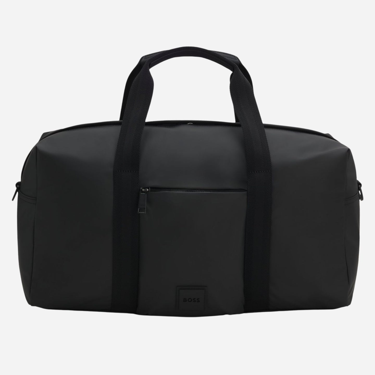 This BOSS Oryo holdall has been created using black polyester and polyurethane, with a matching black polyester lining and polished gunmetal-coloured trims. Inside the zip closure you’ll find a main compartment with a zip pocket, three slip pockets (two small and one pen-sized), and a patch with the BOSS brand name, and on the outside, you’ll see a zipped front pocket for extra organisation. Additionally, at the the back of the back you'll see a trolley strap for convenience during travel. This versatile holdall features two grab handles and an adjustable and removeable cross body strap so you can carry or wear it in a variety of ways. The BOSS brand name is seen most noticeably embossed on a patch on the front of the bag.