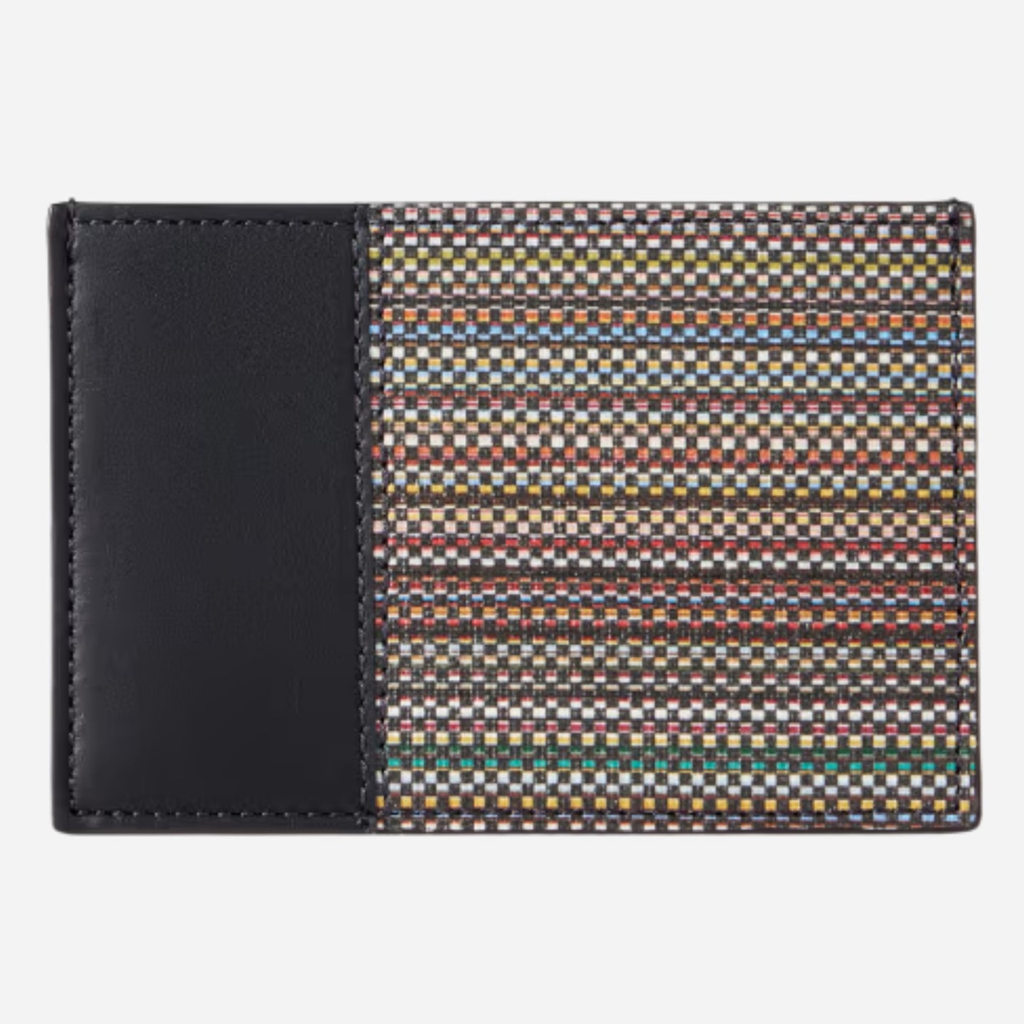 This Paul Smith card holder is part of the Signature Stripe collection, and is created using black smooth leather, black fabric lining, plus coated canvas. It features two card slots on the back, plus an extra top slot. You'll also find the Paul Smith brand name embossed on the back of the card holder in gold foil. This sleek card holder is a stylish and compact way to keep your essentials handy. On the day of purchase this Paul Smith Coated Canvas card holder will be presented inside a bespoke gift box.