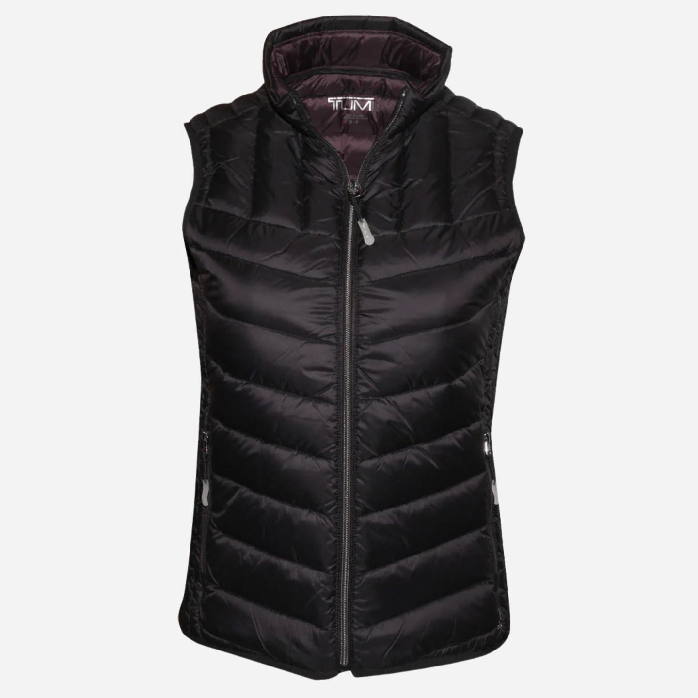 This innovative women's jacket from TUMI PAX collection is based on their signature EG5 formula, the EG5 formula ensures that each item is made to perform in various weather conditions, providing versatility, while the shape is said to provide the “ultimate fit” and functionality. This stylish puffer vest is made from lightweight, water-resistant nylon material in black and is filled with down insulation. The puffer vest for women comes with 2 front zip hand-warmer pockets and engineered seams for shape. The TUMI vest is more than just a piece of clothing; it is designed to convert down into a travel pillow through a hidden pouch in the collar. This TUMI women’s puffer vest comes with some subtle branding, the zips feature the brand name and the brand name can also be seen on the front bottom pocket.