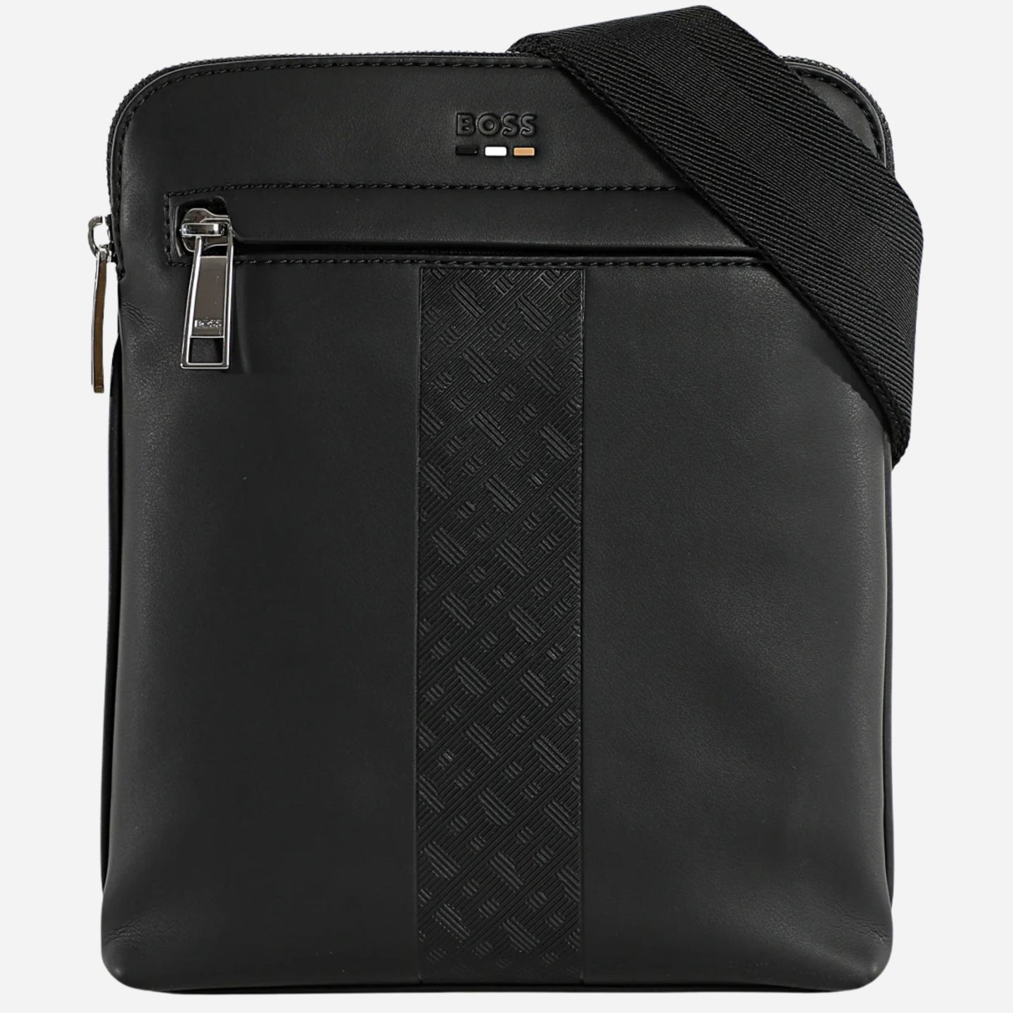 This BOSS faux leather envelope bag is from their Ray collection and is created using black synthetic materials with a decorative patterned stripe on the front. This black bag zips closed and features branded zip pulls, polished silver-tone hardware, and a roomy interior that includes a zipped pocket, two slip pockets and the BOSS logo with the signature stripes. On the front, you'll find another zipped pocket for extra organisation. The fabric cross body strap is adjustable so this Ray envelope bag can be worn in a variety of ways.