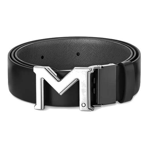This Montblanc palladium and ruthenium 'M' pin buckle is made with reversible plain black leather and saffiano leather in grey on the reverse strap. Montblanc's palladium 'M' pin buckle belt is a gret statement piece for both casual attire and a smart office look. This reversible leather belt has Montblanc's iconic snow cap emblem on the corner of the M for subtle branding. This reversible black and grey leather belt can be cut to your required length using our belt cutting guide. This will come in a branded gift box which can be plaque engraved at the time of purchase.