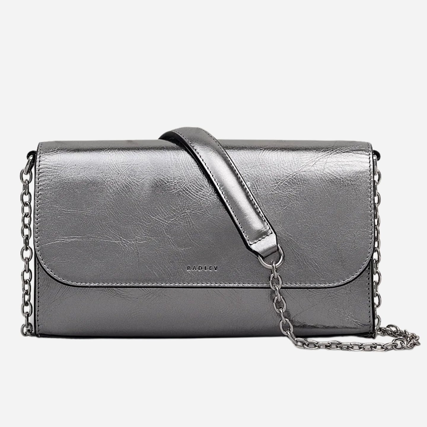This micro flapover cross body bag from Radley is part of their The Rathbone collection and is a different take on the typical cross body bag. Crafted from silver metallic leather with faux suede under the flap, this bag goes from wallet to cross body bag in no time. The chain and leather strap is removable, using the press-studs on the inside of the bag. No matter which way you choose to use it, this cross is stylish and timeless. Inside you'll find the embossed Radley heritage mark, plus a main compartment that's spacious enough for a phone, six card slots, two slip pockets, and a zip pocket with a silver mini metal puller. The sides of the bag feature V-shaped side gusset detailing, and the Radley brand name is embossed on the flap. On the day of purchase, this The Rathbone cross body bag will come with a Radley dust bag to keep it safe and clean when not in use.