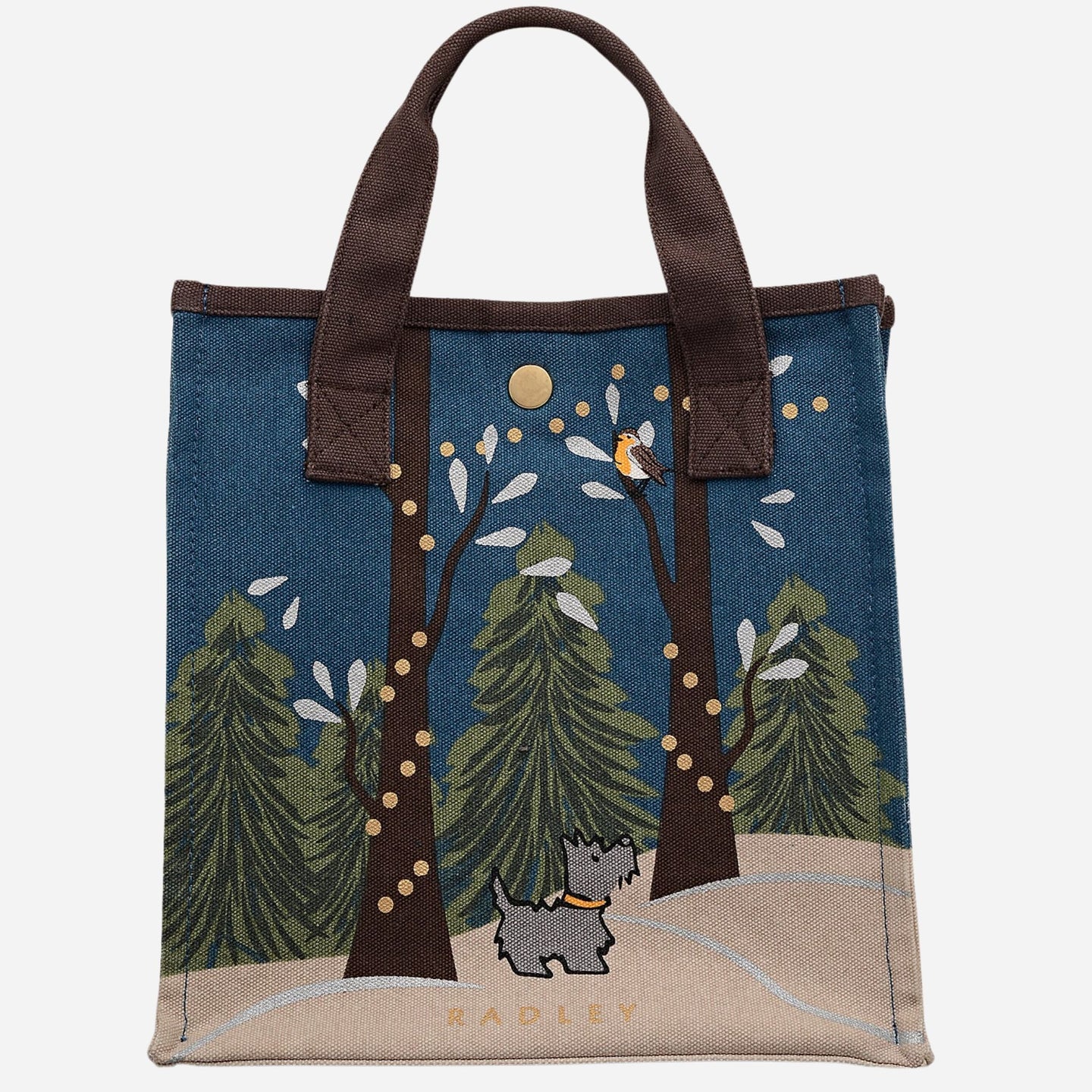 This Radley Responsible collection small grab bag is part of their Winter Tales range, created using recycled cotton canvas and designed with a colourful, wintery scene print inspired by the artwork on the Christmas picture bag. It features the Radley Scottie dog mascot gazing at a bird in the branches of trees which are draped in festive lights. The open top does include a press-stud that can fasten the sides of the bag together, and inside the spacious main compartment you'll see a hanging interior zipped pocket perfect for keeping small essentials organised. Each design in the Radley Responsible collection is made using materials, such as recycled nylon and recycled polyester made from plastic bottles, yet still crafted with the same attention to detail as their leather styles.