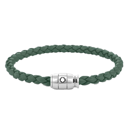 This Montblanc bracelet is made from woven smooth leather in Pewter green featuring a snake chain effect. The leather bracelet attaches and secures into place on your wrist with the stainless steel clasp featuring three thin bands and the Montblanc brand name engraved on the front for subtle branding purposes. On the day of purchase, this Montblanc men's pewter leather and steel 3 ring bracelet will come packaged inside a Montblanc presentation box accompanied by a 2-year warranty certificate. This bracelet will come with a dust bag.