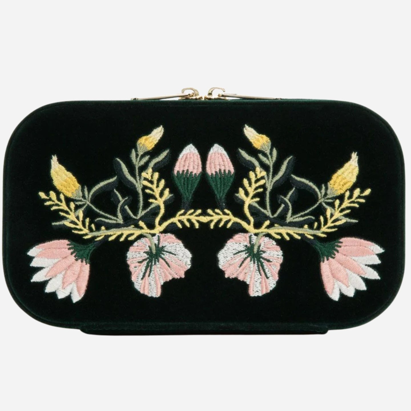 This feminine and functional travel zip jewellery case from WOLF has been designed as part of their sophisticated but playful Zoe collection. Created using rich forest green velvet, this case features a mirror, three ring rolls, two side compartments, and a medium compartment with an embroidered cover, all secured with zip around closure. The interior lining is protected with LusterLoc™, which allows the absorption of hostile gases known to cause tarnishing, and will help keep your jewellery looking like new. The look is finished with an elegantly embroidered floral design on the top that adds romance to your travel accessories. This Zoe travel zip jewellery case will be presented inside a WOLF bespoke presentation box.